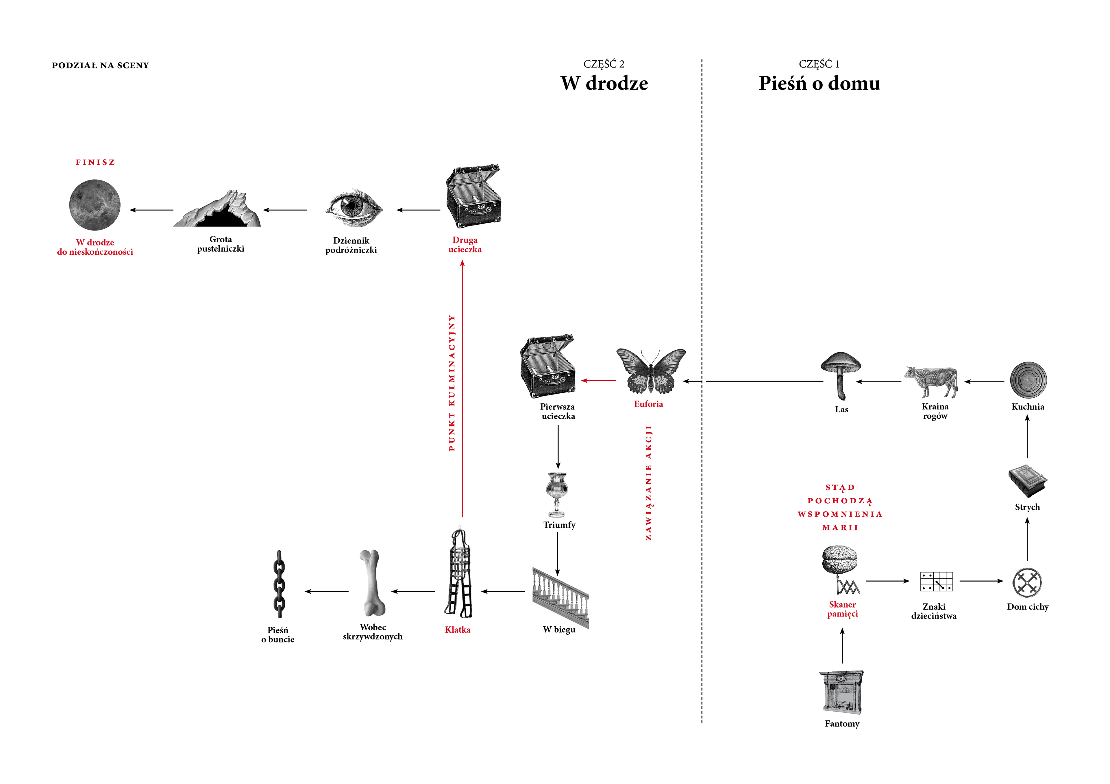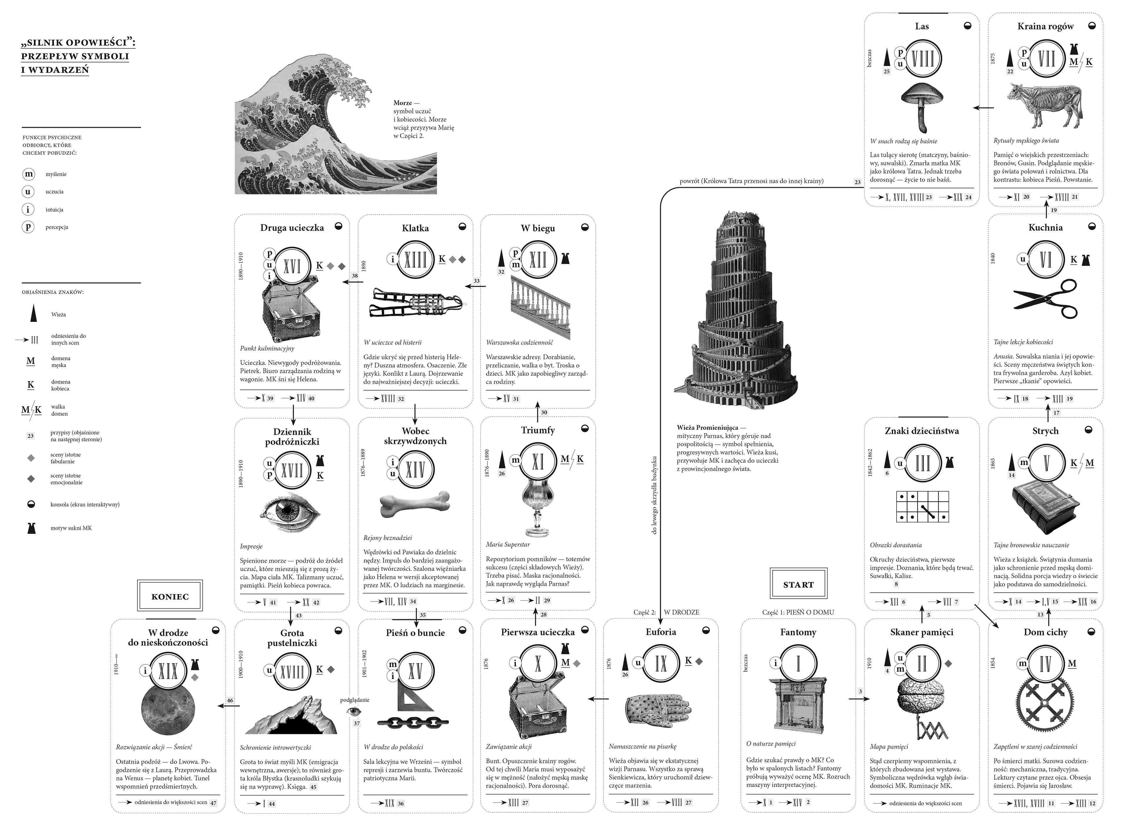 The second part of the exhibition, entitled “On the Road,” describes the life and work of Maria Konopnicka as a mature woman who made the uncompromising decision to become independent and take on the role of a writer in a difficult era. Breaking up with her husband (one of the first scenes in this part) is the first courageous decision in her life, the beginning of a great adventure, the start of an avalanche of events. The convention of storytelling through MK's direct accounts (memories, dreams, traces of emotions), initiated in part 1, is continued here until the very end. The narrative becomes even more cinematic—we can divide it into three basic pillars of the plot: the beginning of the action (“throwing into adventure”—scene IX, ‘Euphoria’), the climax (scene XIII, “The Cage”), and the resolution of the action (scene XIX, On the Way to Infinity). Now the narrative accelerates, marked by movement, the drive for self-improvement, ambitious approaches to problems, and numerous escapes. In each scene, the story is told through set design, multimedia, graphics, and soundscape. The viewer of the exhibition experiences the great journey of life, during which the writer makes up for lost years spent in unfulfillment and minimal growth in ambition. The viewer of the exhibition experiences a great journey of life, during which the writer makes up for lost years spent in unfulfillment and minimal growth in ambition. The lessons she learned in earlier years come in handy on this journey. We also discover the spiritual wounds caused by being stuck in the destructive role of a hostage to her ambitions. MK functions in a world full of contrasts, social injustice, and the humiliation of women. She cultivates the memory of her lost freedom and lives in the hope of regaining it. The most interesting thing seemed to be finding in her biography those elements, facts, or phenomena that can be accepted and recognized as the real reasons for her life and intellectual decisions. This is the “meat” of the script — seemingly obvious in the case of a film or novel, but unheard of in the case of a museum exhibition.