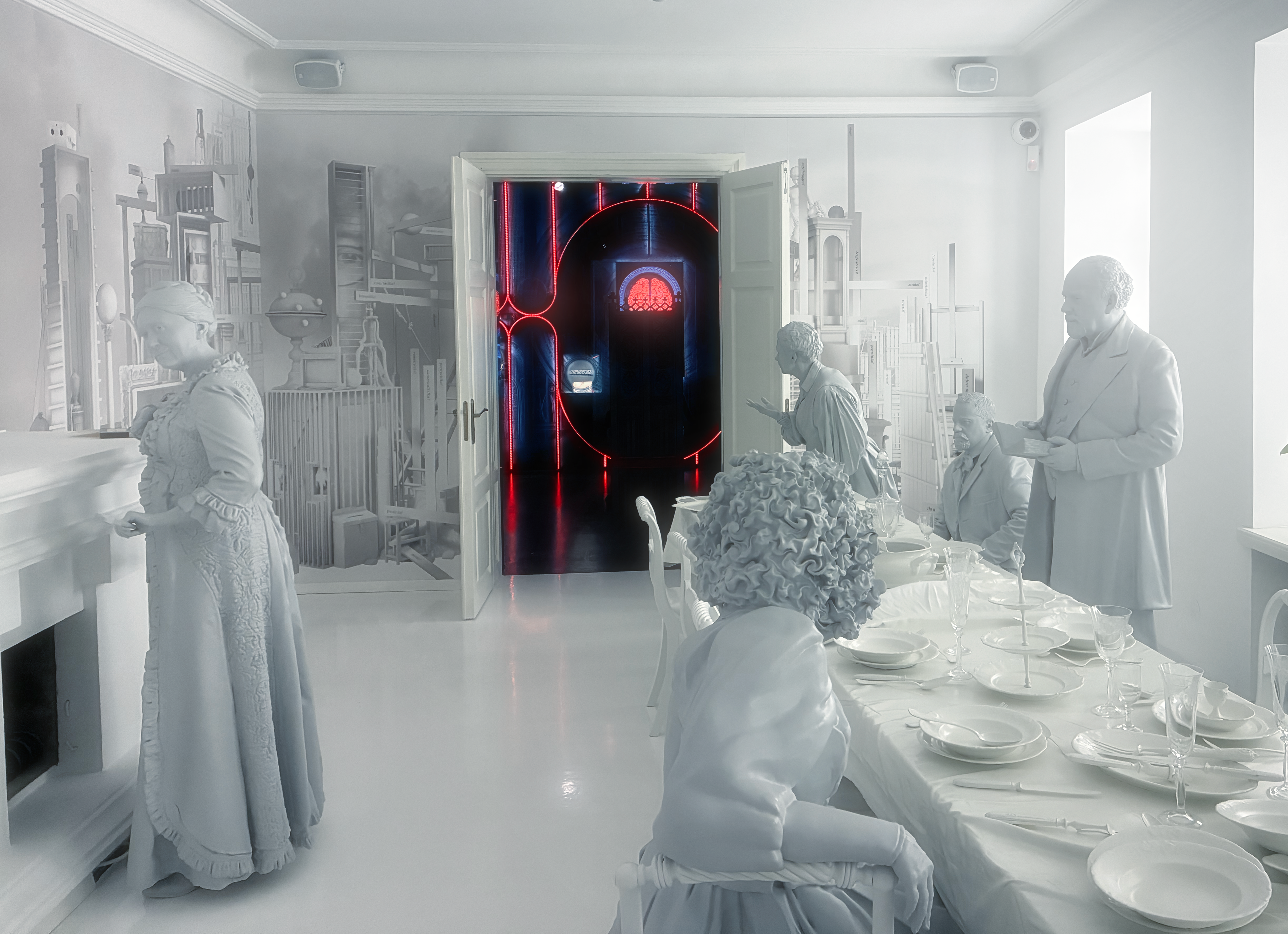 And then the words were transformed into stage design, multimedia, sculptural objects, display cases, and graphic installations.